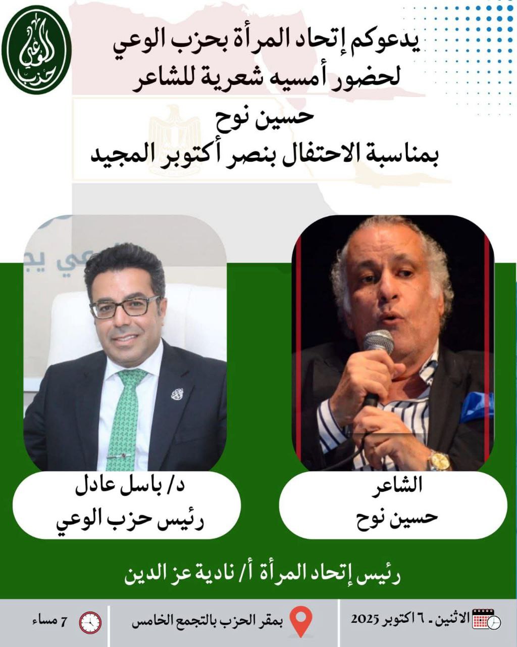 يعقد حزب الوعي برئاسة الدكتور باسل عادل، رئيس الحزب، أمسية شعرية مميزة يحييها الشاعر حسين نوح، وذلك احتفالًا بذكرى نصر أكتوبر المجيد.