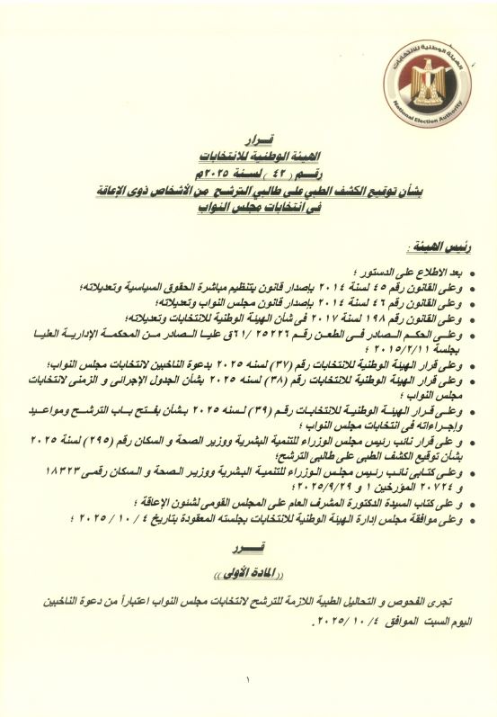 أصدرت الهيئة الوطنية للانتخابات برئاسة القاضى حازم بدوى، القرار رقم 42 لسنة 2025 بشأن توقيع الكشف الطبى على طالبي الترشح من الاشخاص ذوى الإعاقة فى انتخابات مجلس النواب.