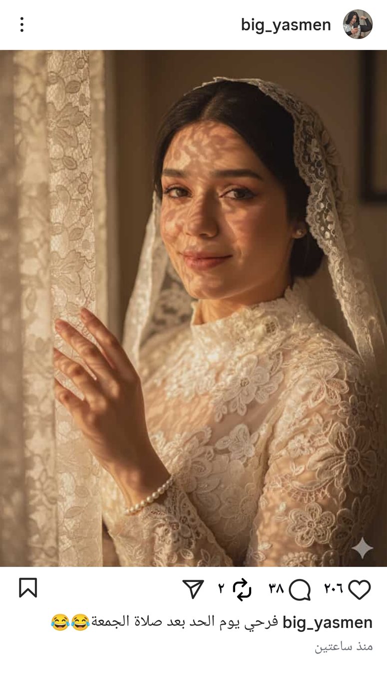 ونشرت بيج ياسمين صورة لها بفستان حفل الزفاف، وأرفقت المنشور بإيموجي ضاحك، ومن غير الواضح إن كانت تمازج جمهورها، أو ستتزوج فعلا، أو حيلة لجذب الإنتباه وتصدر التريند.