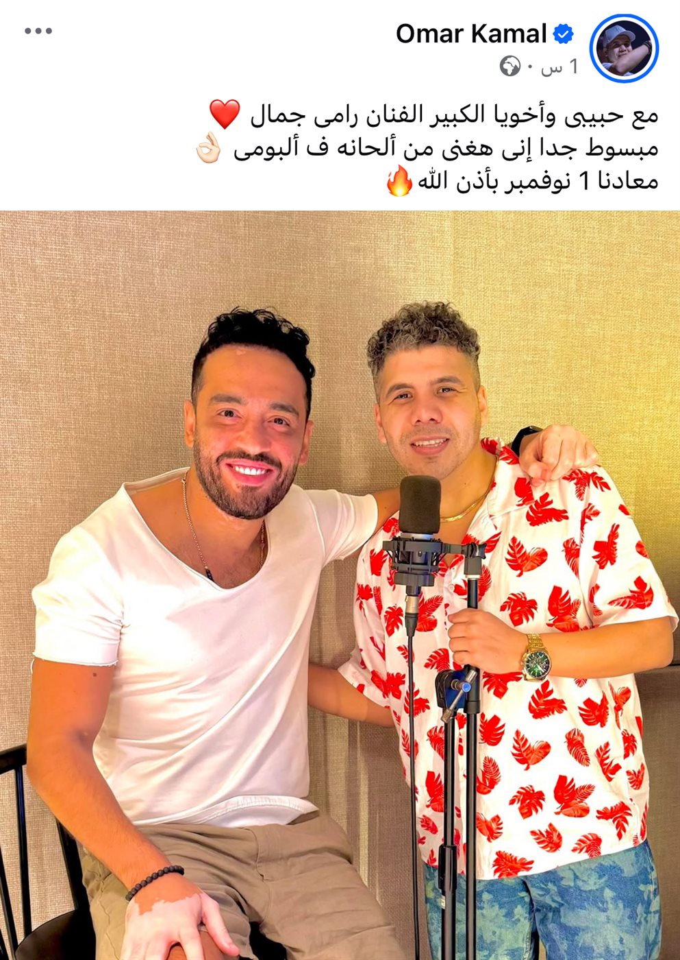 ونشر عمر كمال صورة جمعته مع رامي جمال من كواليس تسجيل أغنيته الجديد، عبر حسابه الشخصي على موقع التواصل الإجتماعي "فيس بوك"، وكتب: "مع حبيبى وأخويا الكبير الفنان رامي جمال، مبسوط جدًا إنى هغني من ألحانه في ألبومي، معادنا 1 نوفمبر بأذن الل"ه.