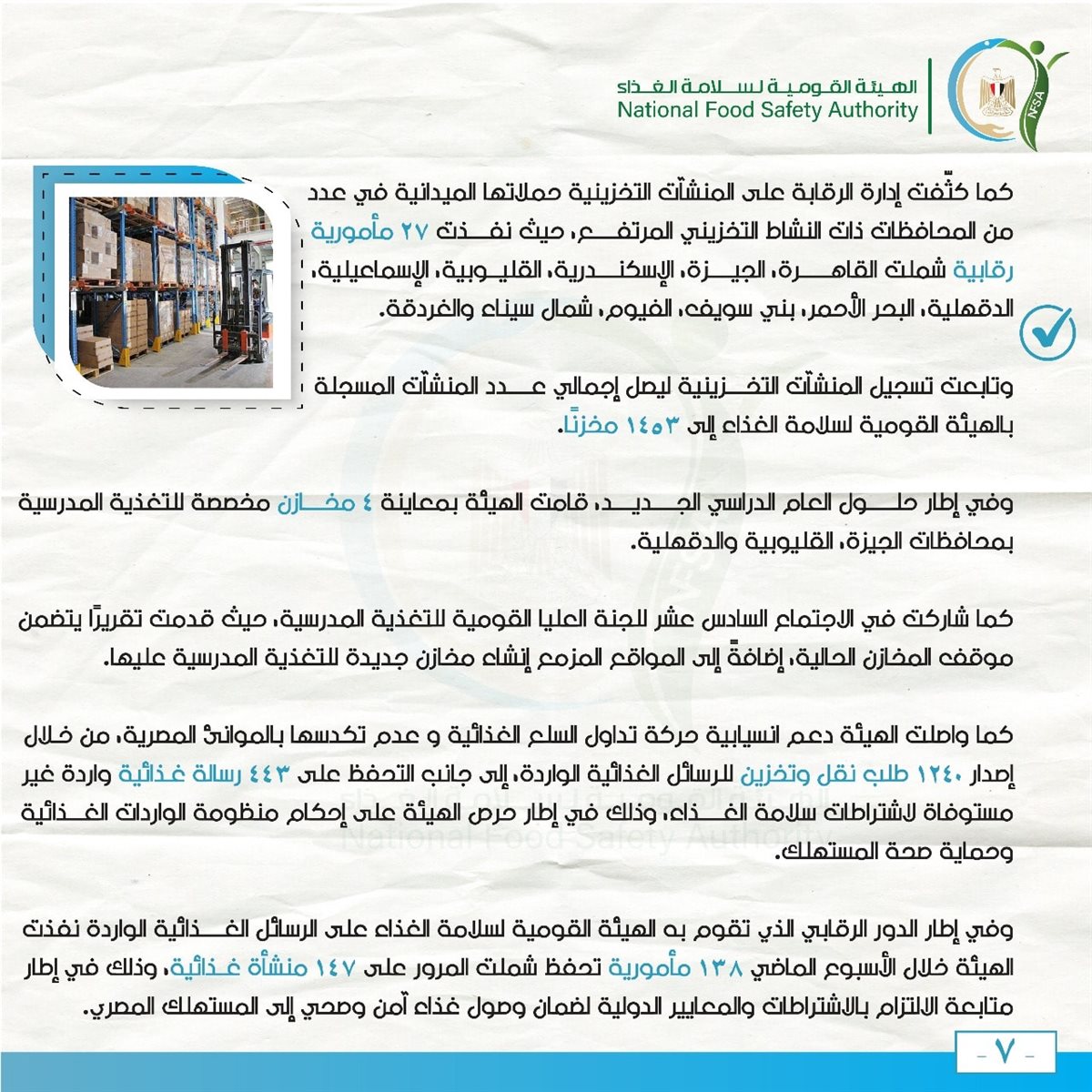 وفي إطار حلول العام الدراسي الجديد، قامت الهيئة بمعاينة 4 مخازن مخصصة للتغذية المدرسية بمحافظات الجيزة، القليوبية والدقهلية.