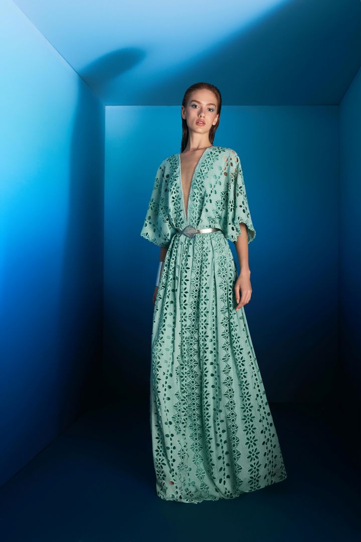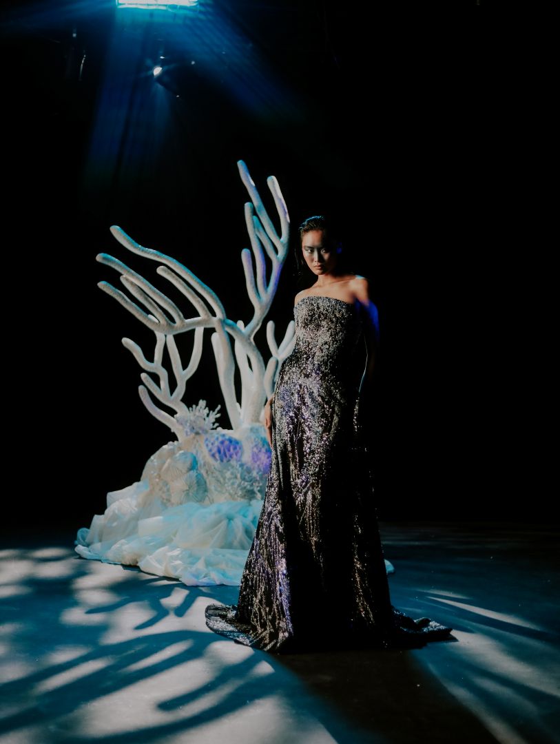فلقد استمد إلهامه من قارة أتلنتس المندثرة تحت المياه، واستعان بتموجات الكشاكش والموسلين المتداخلة مع قماش الأورغنزا التي ترمز إلى سطح الماء، بينما تألق التطريز اللامع على القماش ليجسد فكرة الشعب المرجانية في قعر المحيط.