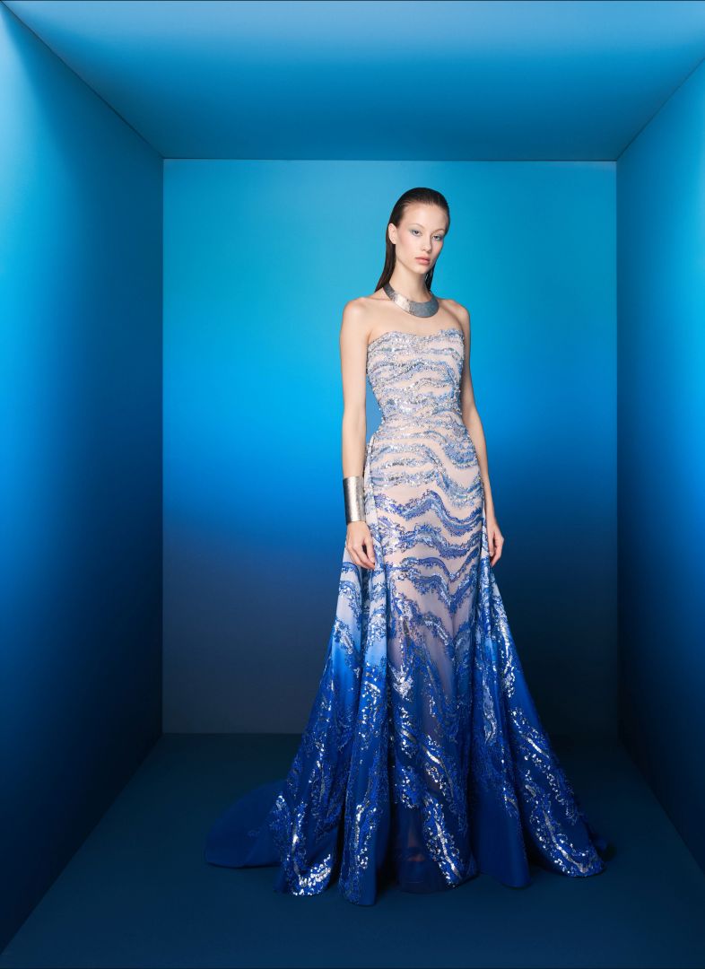 وقد أعجبنا فستان حورية البحر المطرز بالشعب المرجانية، وهو مطرز بتدرج لوني مذهل من الأزرق السماوي إلى الأرجواني الداكن وهو مُرصّع بأحجار كريستالية مُركّزة على الأزرق الفاتح، بينما يُضفي شق عميق انسيابية على الحركة وتم تنسيق تنورة خلفية تمتد كذيل طويل مبطن بالكريب الساتاني الأزرق الداكن الذي يذكرنا بعمق المحيط.