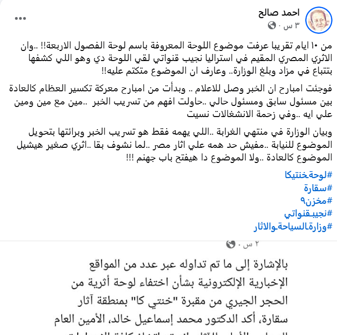 وجاء منشور صالح تعليقًا على اختفاء لوحة أثرية من مقبرة في سقارة، وهي مقبرة خنتي كا ضمن المجموعة الجنائزية للملك تتي.