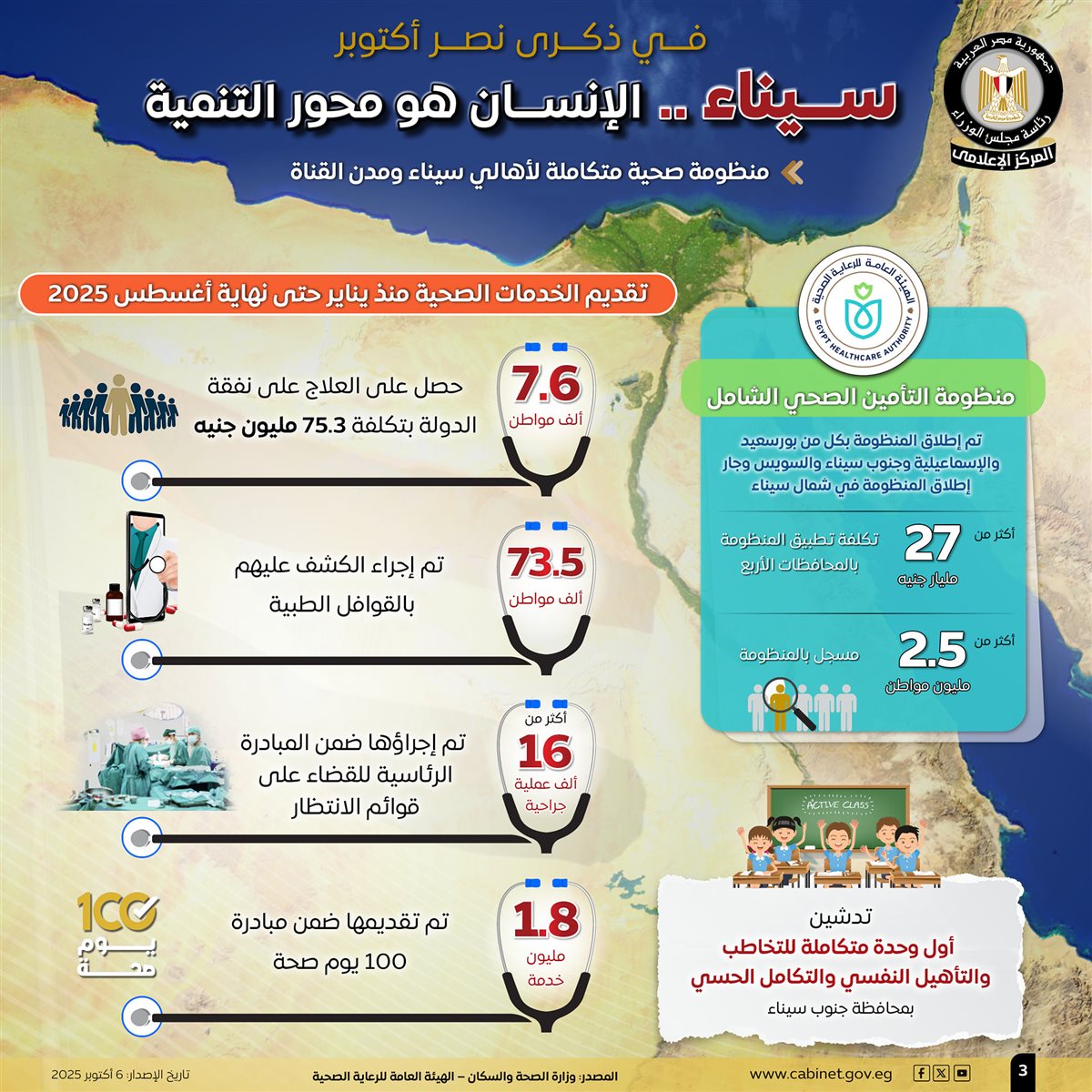وتطرقت الإنفوجرافات إلى المنظومة الصحية المتكاملة لأهالي سيناء ومدن القناة، فعلى صعيد منظومة التأمين الصحي الشامل، تم إطلاق المنظومة بكل من بورسعيد، والإسماعيلية، وجنوب سيناء، والسويس، بتكلفة تجاوزت 27 مليار جنيه، حيث بلغ عدد المسجلين بالمنظومة أكثر من 2.5 مليون مواطن، وجارٍ إطلاق المنظومة في شمال سيناء.
