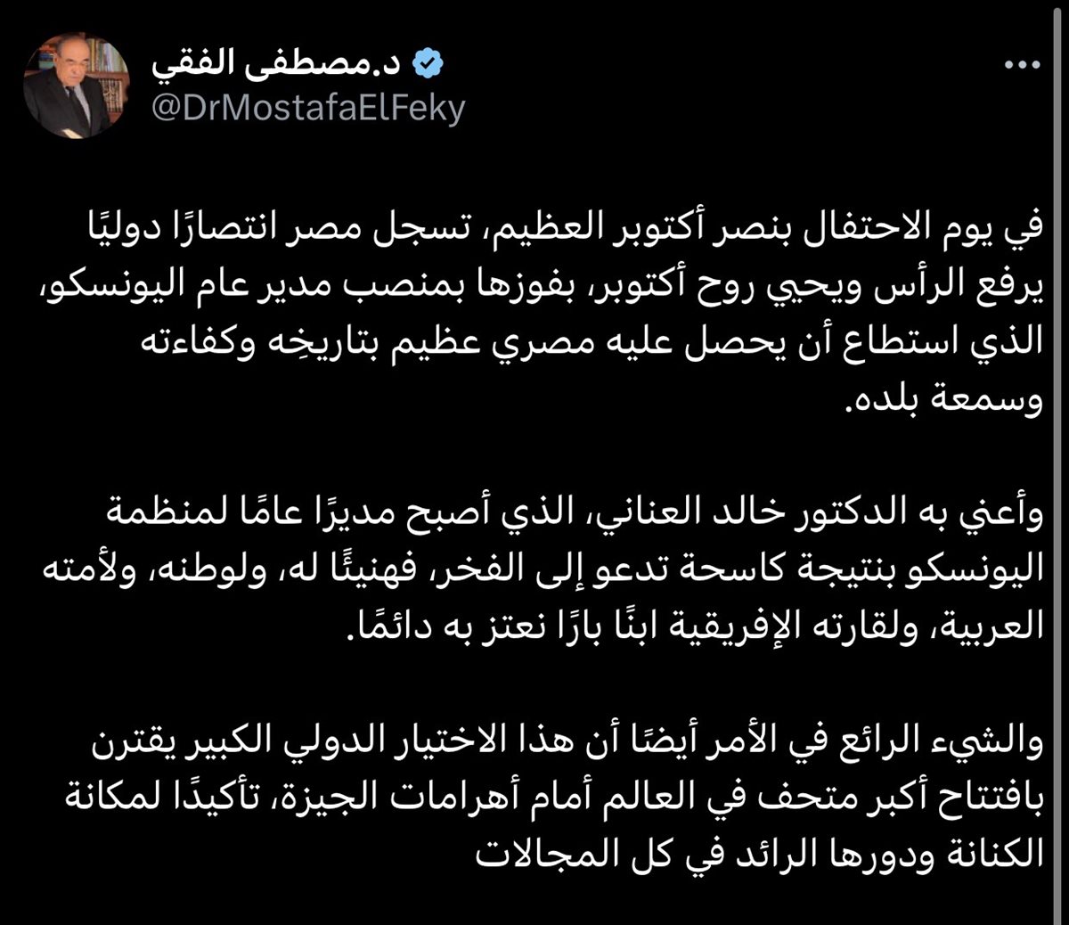 وقال الدكتور مصطفى الفقي في تغريدة له عبر حسابه الرسمي عبر منصة "اكس": “ في يوم الاحتفال بنصر أكتوبر العظيم، تسجل مصر انتصارًا دوليًا يرفع الرأس ويحيي روح أكتوبر، بفوزها بمنصب مدير عام اليونسكو، الذي استطاع أن يحصل عليه مصري عظيم بتاريخِه وكفاءته وسمعة بلده.”