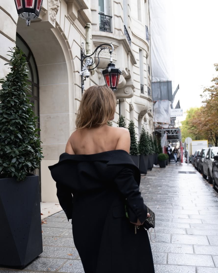 أكملت نيللي إطلالتها بمعطف أسود ضخم أُسدِل على كتفيها بانسيابية محسوبة، في حركة تُضفي بعدًا سينمائيًا يشبه إطلالات نجمات باريس في حقبة الخمسينيات.