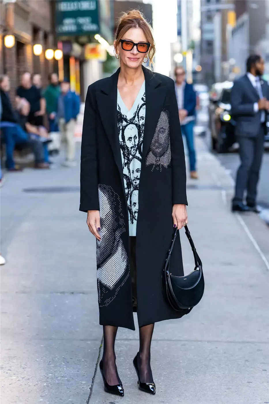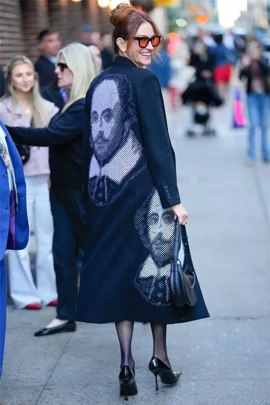 وقد ارتدت النجمة العالمية جوليا روبرتس، البالغة من العمر 57 عاماً، معطفاً أسودَ مُزيناً بصورة للشاعر الإنجليزي ويليام شكسبير خلال تجوالها في مدينة نيويورك أمس الأربعاء.