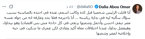 وكتبت داليا أبو عمر في تغريدة لها عبر حسابها على منصة "إكس": "أنا قابلت الرئيس شخصيًا قبل كده، وكاتب اسمي عنده في أجندة بالمناسبة بسبب سؤال سألته له في بداية رئاسته".