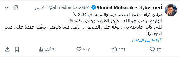 وقال صانع المحتوى أحمد مبارك، عبر منصة إكس، مرتين ترامب دعا السيسي.. والسيسي قاله: لأ