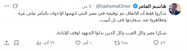 وذكر "هاشم عامر" عبر حسابه على منصة إكس: تذكروا فقط أن الاتفاق تم توقيعه في مصر التي اتهمها الإخوان بالتآمر على غزة وتظاهروا ضد سفارتها في تل أبيب.. شكرا مصر وكل العرب وكل الذين بذلوا الجهود لوقف الإبادة.
