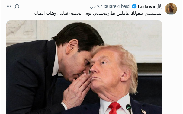 واختتم منشوره قائلا السيسي درّب ترامپ على الكورة وضربها له بتمريرة عرضية عالمرمى والتوقيع صار سهّل عليه سجل الهدف عن طريق تكتيك مصري عبقري.