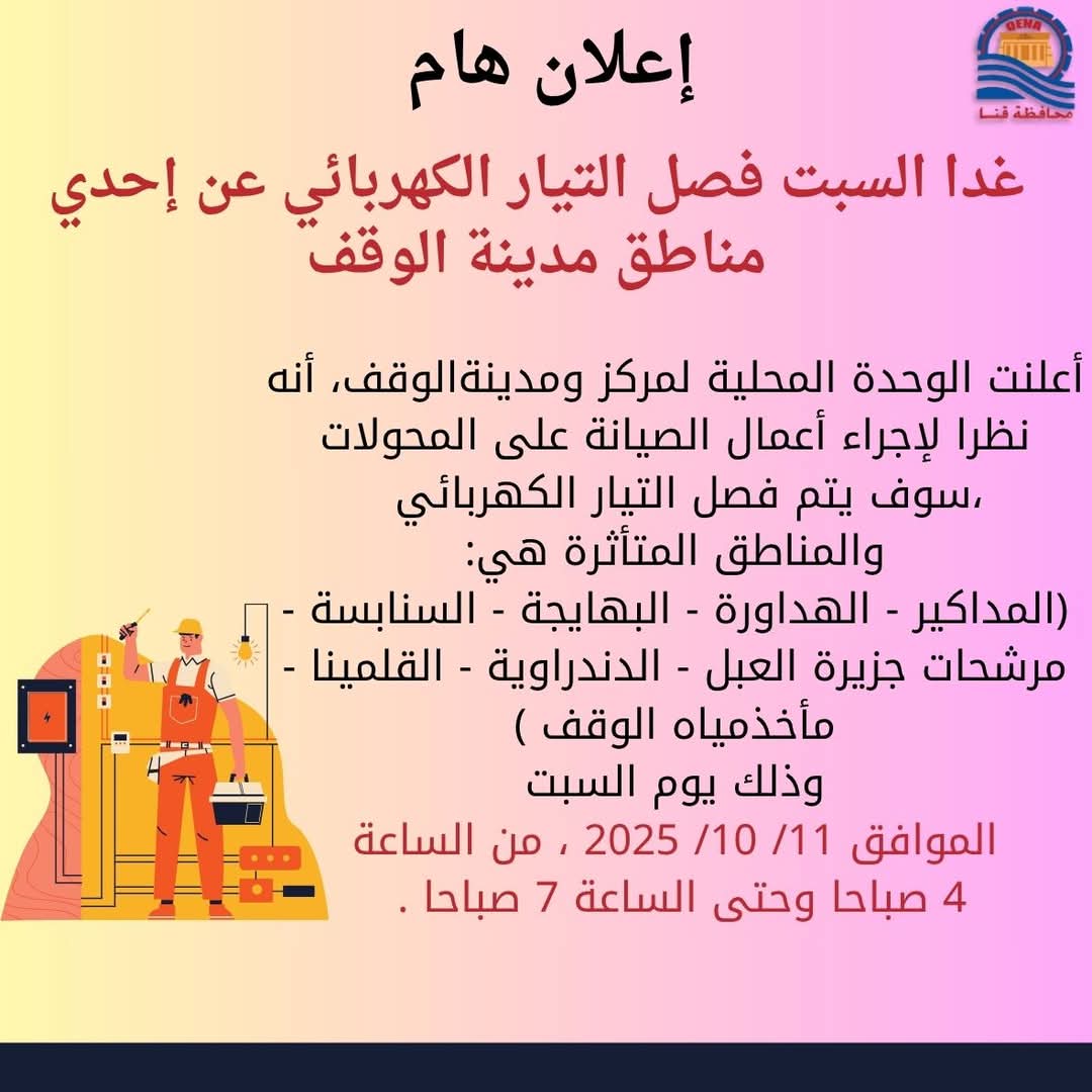 أعلن قطاع الكهرباء بالتنسيق مع الوحدة المحلية لمركز ومدينة الوقف، شمال محافظة قنا، عن تنفيذ أعمال الصيانة الدورية للمحاولات، ما يستلزم فصل التيار الكهربائي صباح اليوم السبت الموافق 11 أكتويدبر 2025.