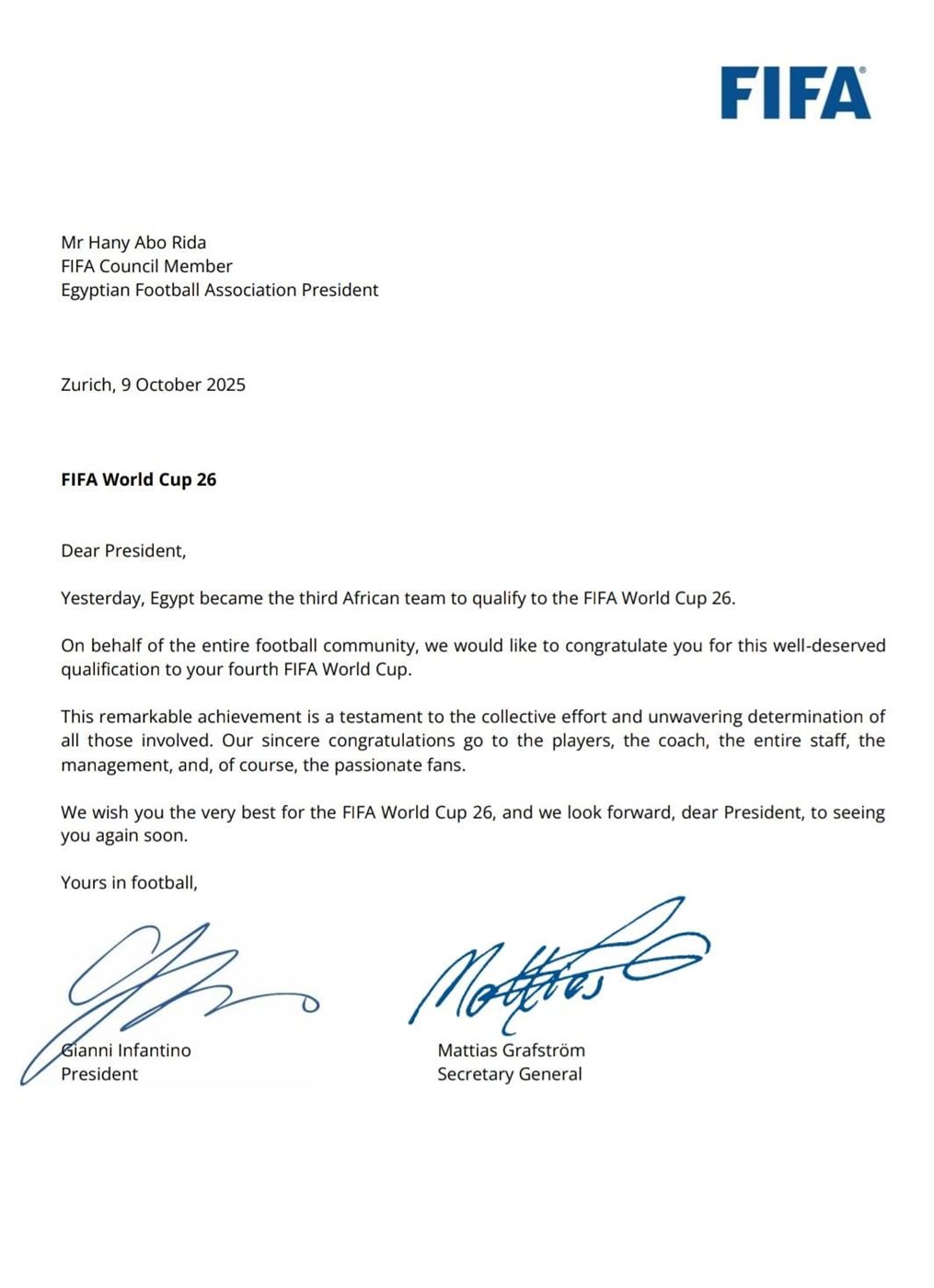 وأرسل رئيس فيفا خطاب تهنئة لأبو ريدة، احتفالًا بتأهل الفراعنة لمنافسات كأس العالم 2026، كما شارك في التهنئة، ماتياس جرافستروم، السكرتير العام لفيفا.