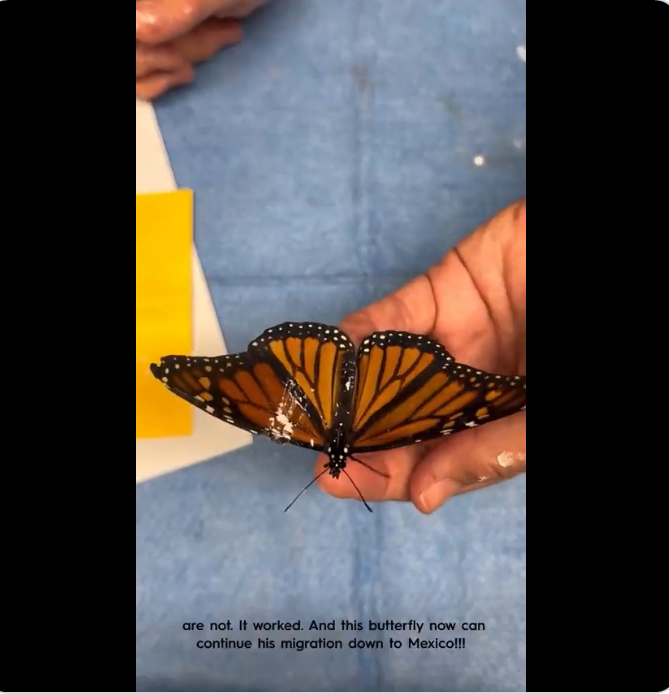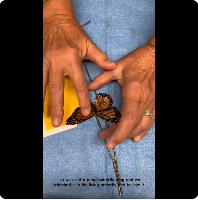 وبعد العثور على التطابق المثالي، خضعت الفراشة لعملية دقيقة استغرقت خمس دقائق، تضمنت استخدام مادة الأسمنت الملامس ونشا الذرة وقطعة صغيرة من الأسلاك لتثبيت الجناح الجديد.