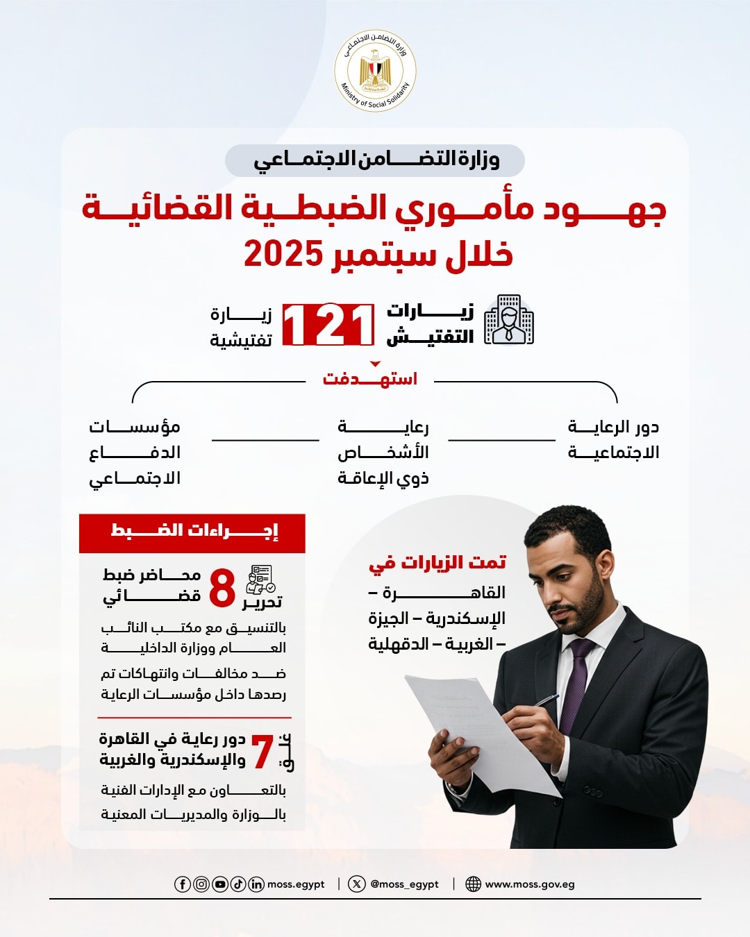 وبلغت عدد الزيارات التي تم تنفيذها من خلال مأموري الضبط القضائي بديوان عام الوزارة والمديريات التابعة لها خلال سبتمبر 2025 عدد 121 زيارة ما بين دور الرعاية الاجتماعية لرعاية الأيتام، ورعاية الأشخاص ذوي الإعاقة، ومؤسسات الدفاع الاجتماعي، وكانت أكثر الزيارات في محافظات القاهرة والإسكندرية والجيزة والغربية والدقهلية.