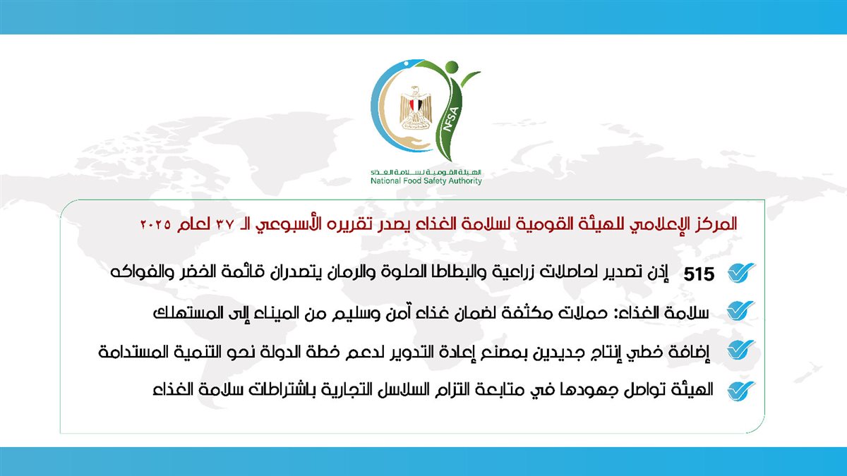 أصدر المركز الإعلامي للهيئة القومية لسلامة الغذاء تقريره الأسبوعي الـ 37 لعام 2025، وذلك عن الفترة من 4 - 10 أكتوبر، والذي تضمن العديد من الأنشطة المختلفة على النحو التالي: