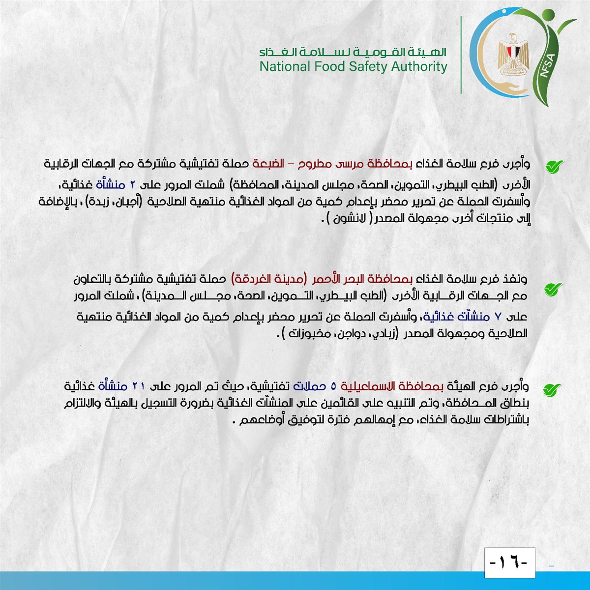 ونفذ فرع سلامة الغذاء بمحافظة البحر الأحمر (مدينة الغردقة) حملة تفتيشية مشتركة بالتعاون مع الجهات الرقابية الأخرى (الطب البيطري، التموين، الصحة، مجلس المدينة)، شملت المرور على 7 منشآت غذائية، وأسفرت الحملة عن تحرير محضر بإعدام كمية من المواد الغذائية منتهية الصلاحية ومجهولة المصدر (زبادي، دواجن، مخبوزات).