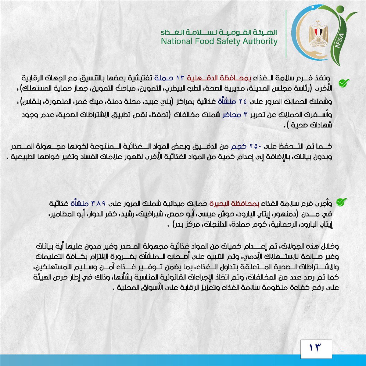 ونفذ فرع سلامة الغذاء بمحافظة الدقهلية 13 حملة تفتيشية بعضها بالتنسيق مع الجهات الرقابية الأخرى (رئاسة مجلس المدينة، مديرية الصحة، الطب البيطري، التموين، مباحث التموين، جهاز حماية المستهلك)، وشملت الحملات المرور على 24 منشأة غذائية بمراكز (بني عبيد، محلة دمنة، ميت غمر، المنصورة، بلقاس)، وأسفرت الحملات عن تحرير 3 محاضر شملت مخالفات (تحفظ، نقص تطبيق الاشتراطات الصحية، عدم وجود شهادات صحية).