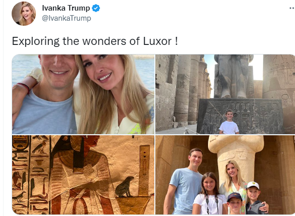 وسابقا حرصت إيفانكا ترامب على نشر صورة لها من زيارتها إلى مصر مع عائلتها من أمام الأهرامات، وكتبت إيفانكا معلقة على الصورةـ "يوم في الأهرامات وقت خاص جدًا لاستكشاف جمال مصر لأول مرة مع عائلتي"