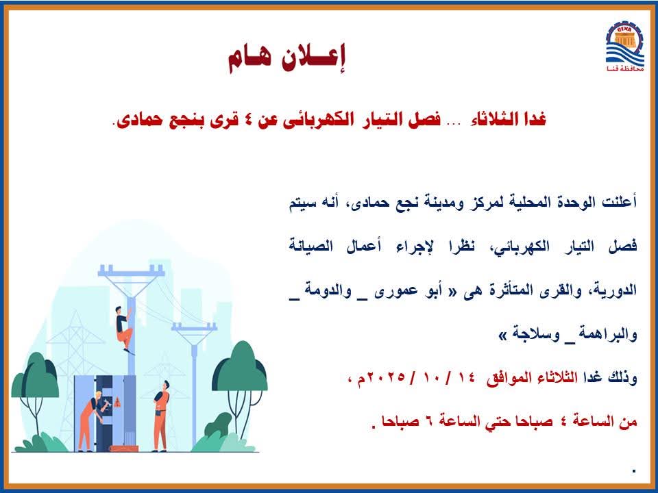أعلن قطاع الكهرباء بالتنسيق مع الوحدة المحلية لمركز ومدينة نجع حمادي، شمال محافظة قنا ، عن تنفيذ أعمال الصيانة الدورية، ما يستلزم فصل التيار الكهربائي صباح غدا الثلاثاء الموافق 14 أكتوبر 2025.