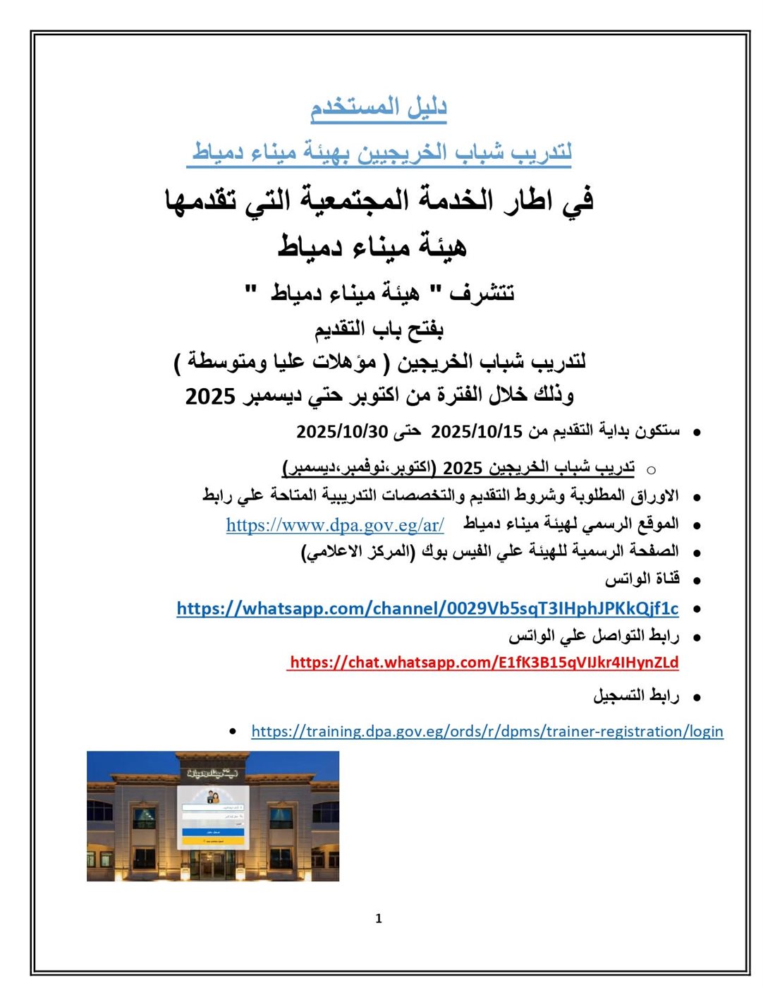 في إطار الدور المجتمعي الذي تقوم به هيئة ميناء دمياط وحرصها على دعم الشباب وتأهيلهم لسوق العمل، أعلنت الهيئة عن فتح باب التقديم لتدريب شباب الخريجين من أصحاب المؤهلات العليا والمتوسطة، وذلك خلال الفترة من أكتوبر وحتى ديسمبر 2025، في خطوة تهدف إلى تمكين الشباب وتنمية مهاراتهم العملية من خلال برامج تدريبية متخصصة داخل الميناء وفي الإدارات المختلفة التابعة له.