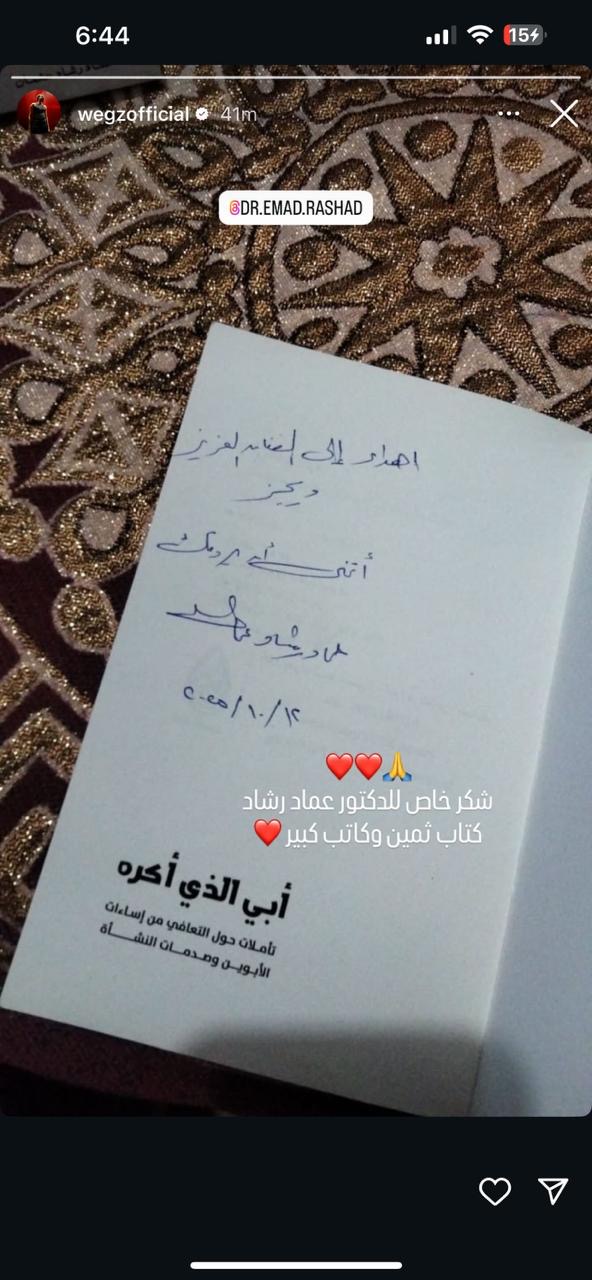 شارك مغني الراب ويجز، متابعيه عبر خاص القصص القصيرة على “إنستجرام”، صورة لغلاف كتابة “أبي الذي أكره” وحمل الكتاب توقيع مؤلفه وهو عماد رشاد عثمان وعلق ويجز “شكر خاص للدكتور عماد رشاد كتاب ثمين وكاتب كبير”.