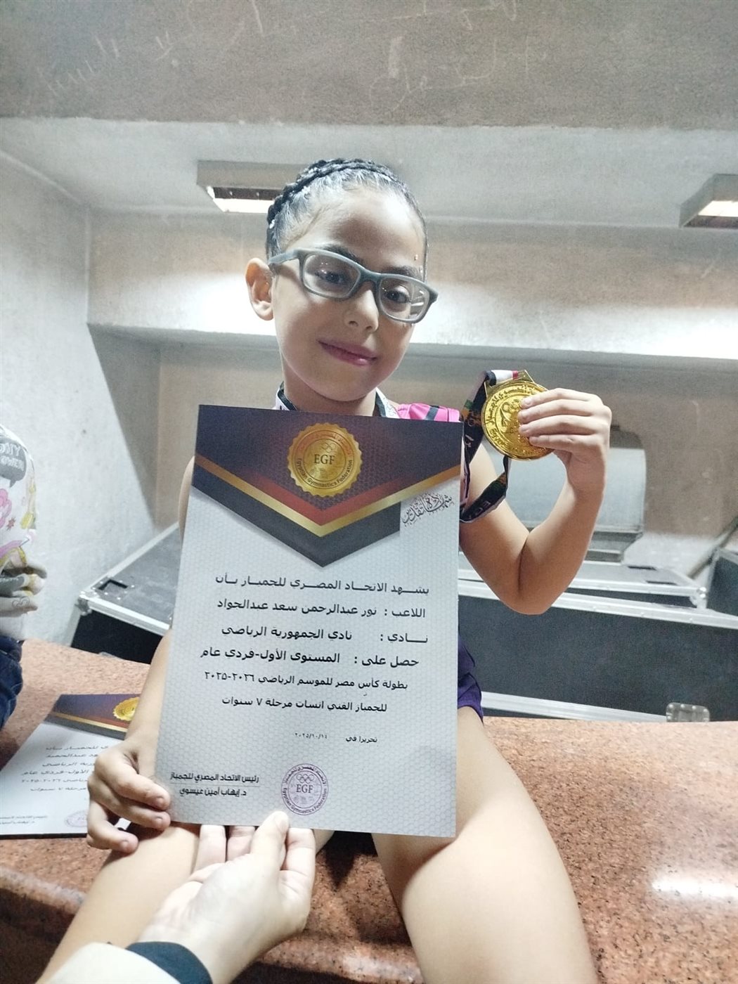 أثبتت الطفلة نور عبد الرحمن سعد عبد الجواد، لاعبة نادي الجمهورية الرياضي بالفيوم، أن الإرادة والموهبة لا ترتبطان بالعمر، بعد أن توجت بالمركز الأول والميدالية الذهبية في بطولة كأس مصر للجمباز الفني إناث – مرحلة 7 سنوات (المستوى الأول فردي عام)، لموسم 2024/2025.