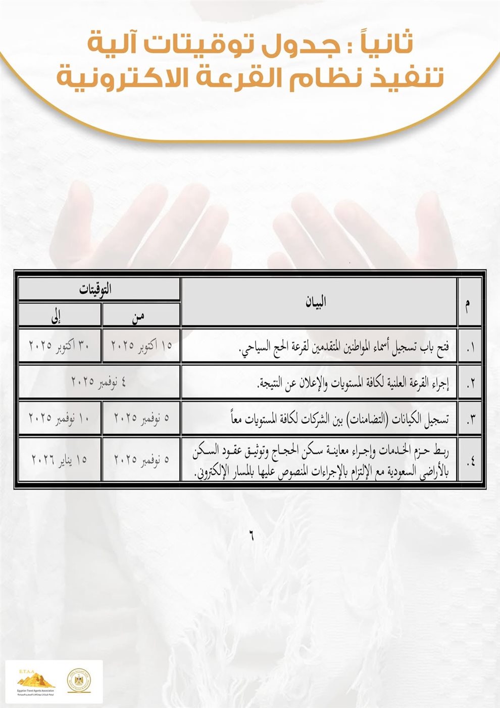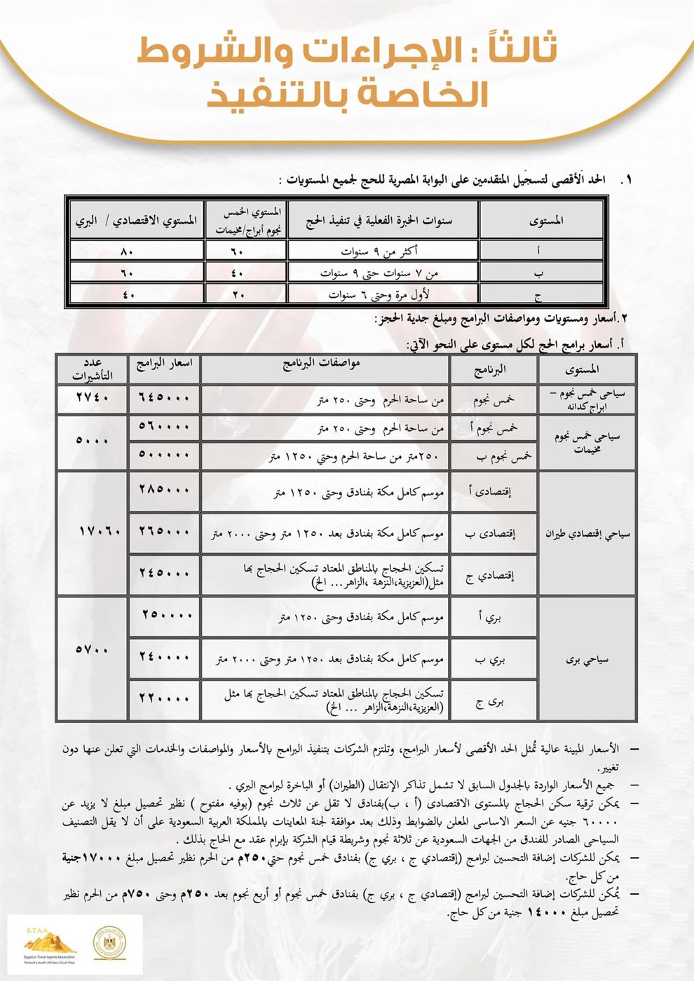 جاء ذلك وفقاً لأحكام قانون 84 لسنة 2022 المنظم للحج، وقانون شركات السياحة رقم 38 لسنة 1977، وبما يضمن تنظيمًا دقيقًا لموسم الحج القادم وتحقيق أعلى مستويات التميز والجودة في الخدمات المقدمة لحجاج السياحة.