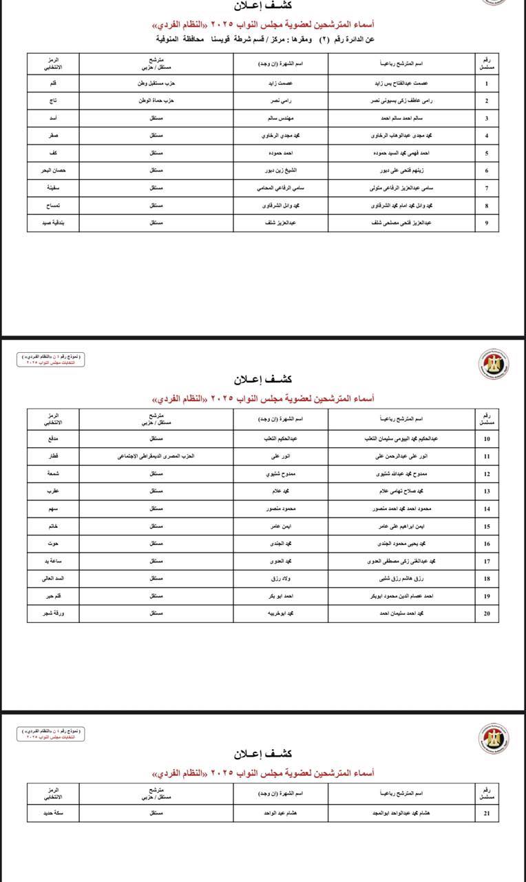 الدائرة الثانية: مركزا قويسنا - بركة السبع ويتنافس 21 مرشح على مقعدين وهم: