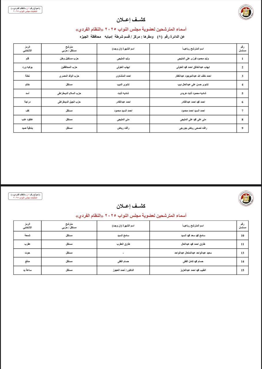 وتضمن الكشفان أسماء المترشحين والصفة التي ثبتت لكل منهم، وحدد الكشف الثاني اسم القائمة التي ينتمي إليها المترشح، على أن يستمر عرض الكشفين على مدار أيام 16 و17 و18 أكتوبر، وتنشرهما الهيئة الوطنية للانتخابات في جريدتي الأخبار والجمهورية.