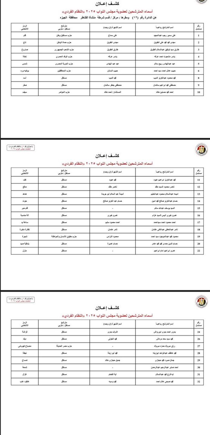 وتضمن الكشفان أسماء المترشحين والصفة التي ثبتت لكل منهم، وحدد الكشف الثاني اسم القائمة التي ينتمي إليها المترشح، على أن يستمر عرض الكشفين على مدار أيام 16 و17 و18 أكتوبر، وتنشرهما الهيئة الوطنية للانتخابات في جريدتي الأخبار والجمهورية.