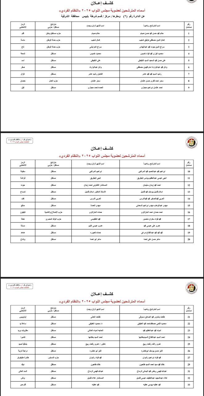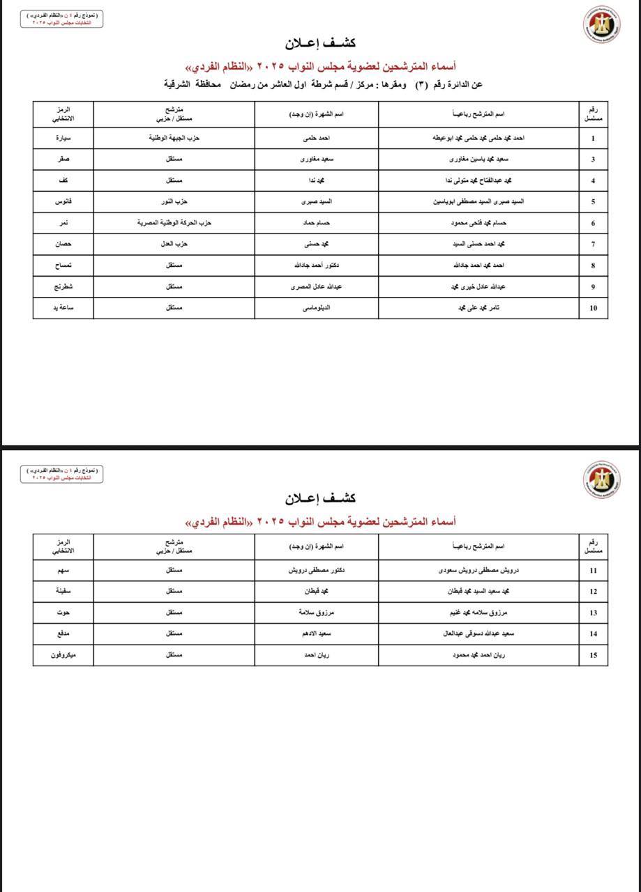 وتضمن الكشفان أسماء المترشحين والصفة التي ثبتت لكل منهم، وحدد الكشف الثاني اسم القائمة التي ينتمي إليها المترشح، على أن يستمر عرض الكشفين على مدار أيام 16 و17 و18 أكتوبر، وتنشرهما الهيئة الوطنية للانتخابات في جريدتي الأخبار والجمهورية.