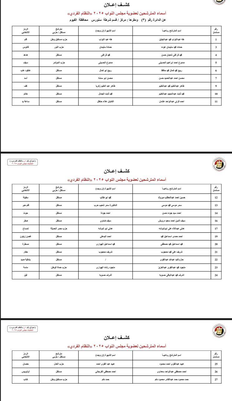 ننشر أسماء المرشحين فى انتخابات النواب بمحافظة الفيوم