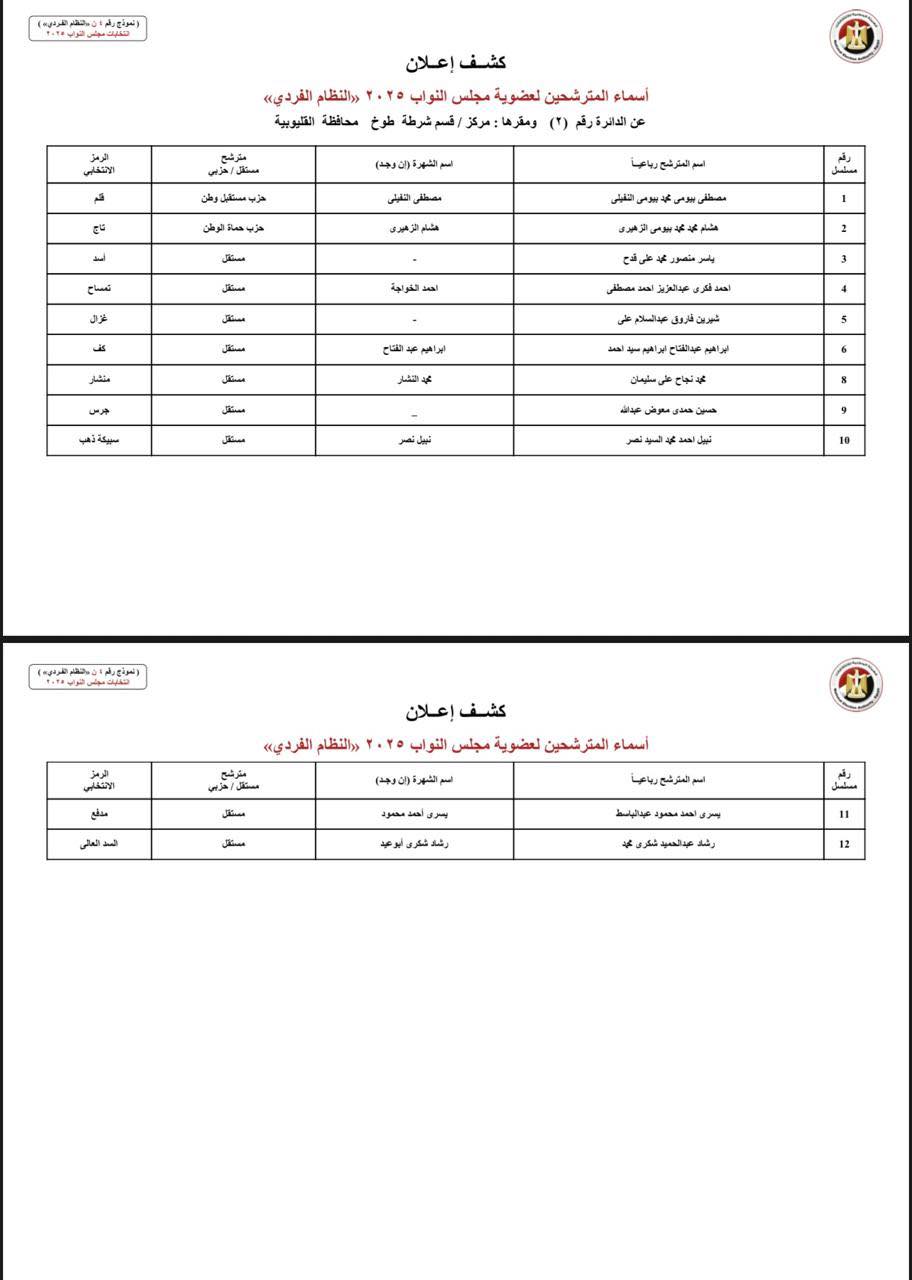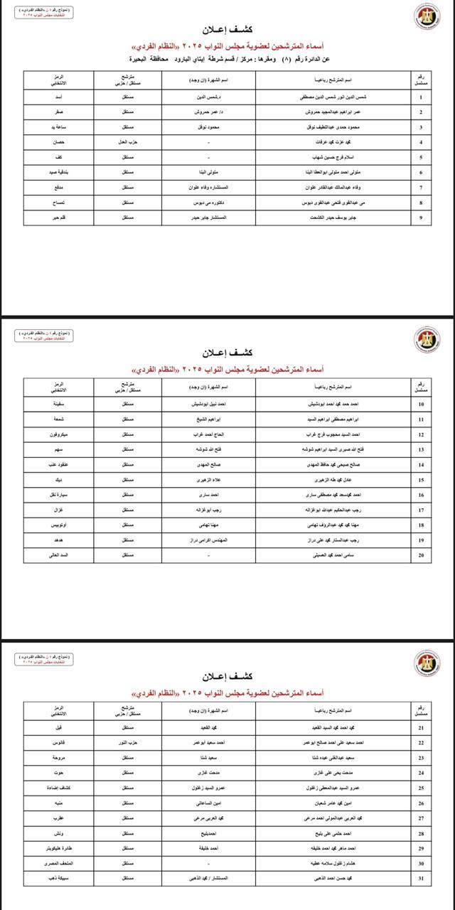 وتضمن الكشفان أسماء المترشحين والصفة التي ثبتت لكل منهم، وحدد الكشف الثاني اسم القائمة التي ينتمي إليها المترشح، على أن يستمر عرض الكشفين على مدار أيام 16 و17 و18 أكتوبر، وتنشرهما الهيئة الوطنية للانتخابات في جريدتي الأخبار والجمهورية.