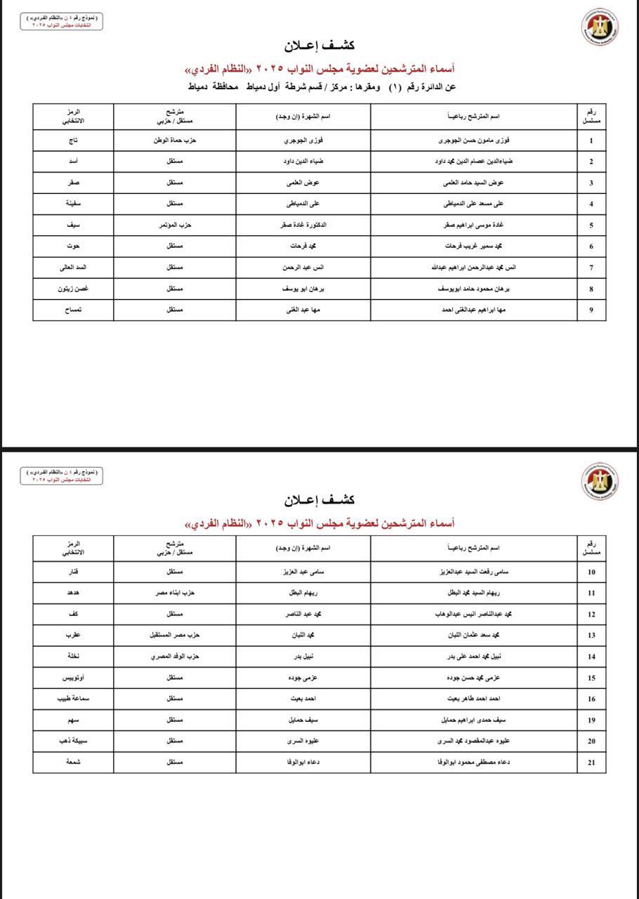 وتضمن الكشفان أسماء المترشحين والصفة التي ثبتت لكل منهم، وحدد الكشف الثاني اسم القائمة التي ينتمي إليها المترشح، على أن يستمر عرض الكشفين على مدار أيام 16 و17 و18 أكتوبر، وتنشرهما الهيئة الوطنية للانتخابات في جريدتي الأخبار والجمهورية.