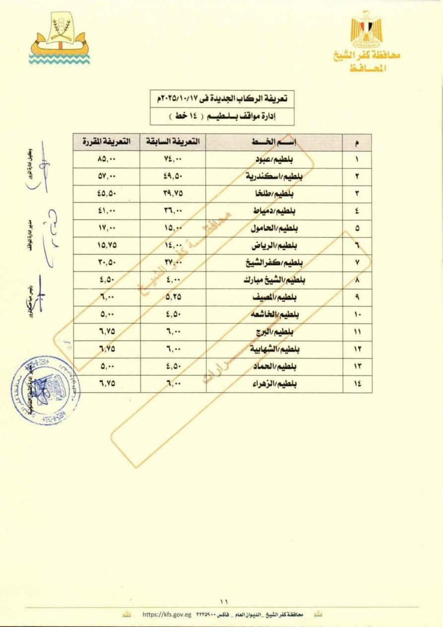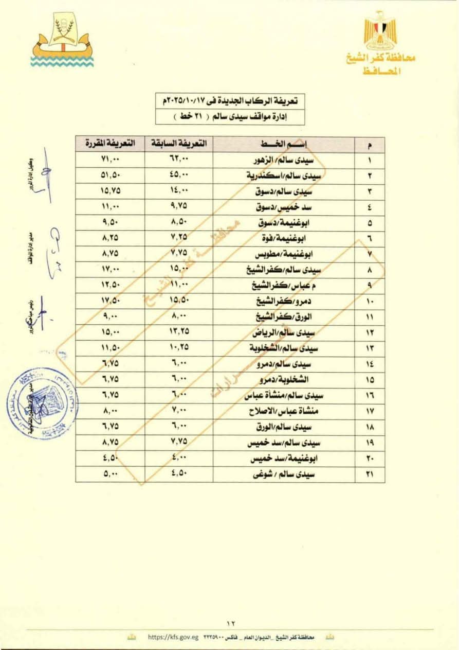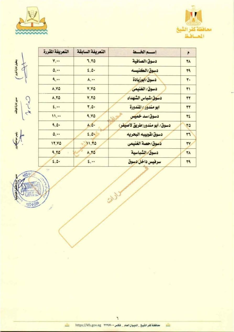 اعتمد اللواء دكتور علاء عبد المعطي، محافظ كفر الشيخ، اليوم الجمعة، التعريفة الجديدة لنقل الركاب على جميع خطوط المواصلات العامة، الداخلية والخارجية، بنطاق المحافظة، وذلك عقب قرار لجنة التسعير التلقائي للمنتجات البترولية بوزارة البترول بتحريك أسعار المنتجات البترولية اعتبارًا من اليوم، محذرًا من استغلال المواطنين أو تحصيل أي مبالغ إضافية تتجاوز التعريفة الرسمية المقررة.