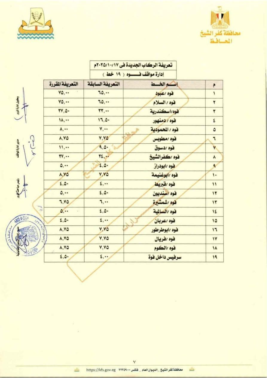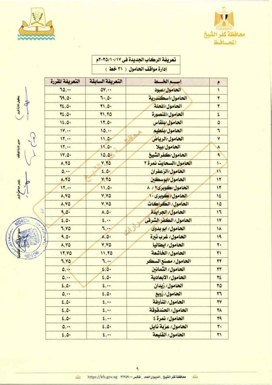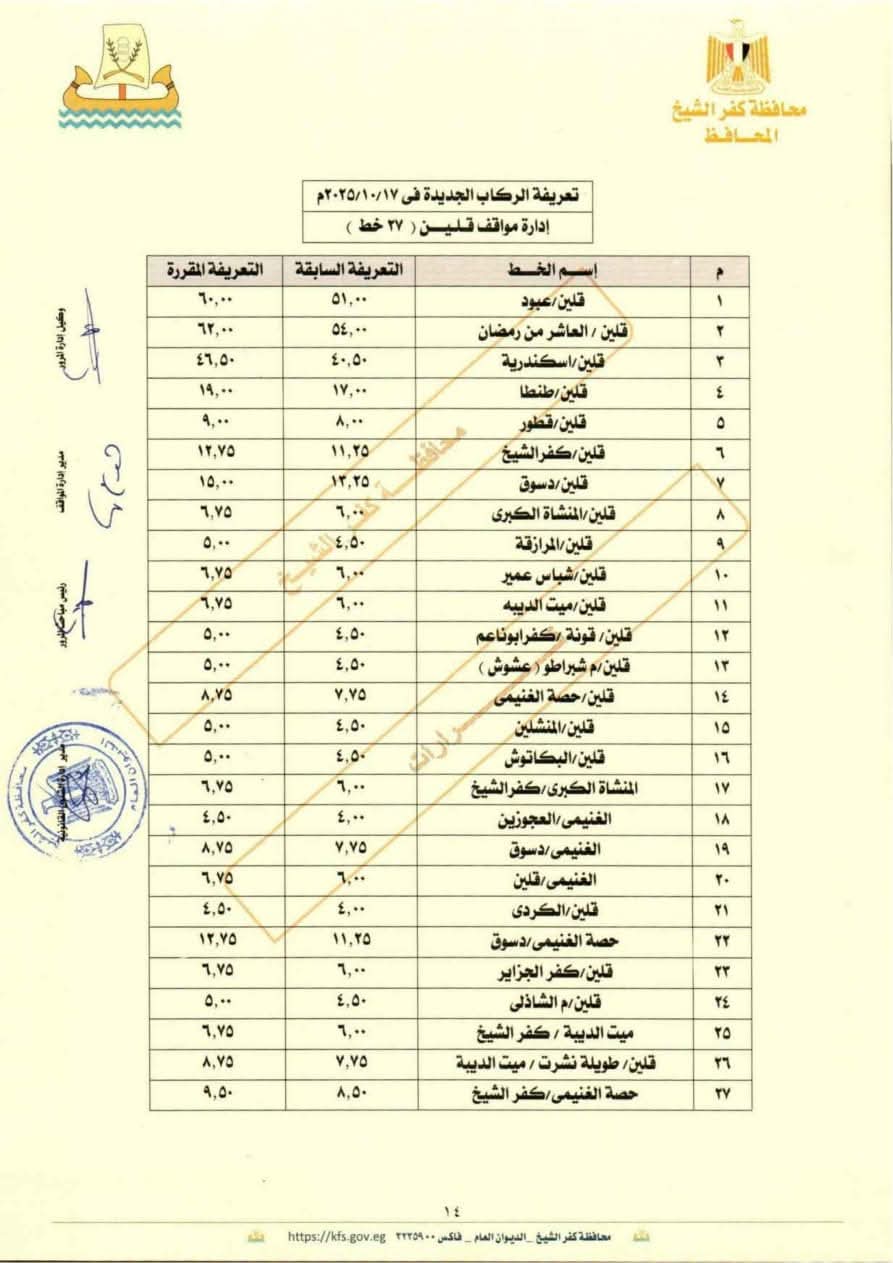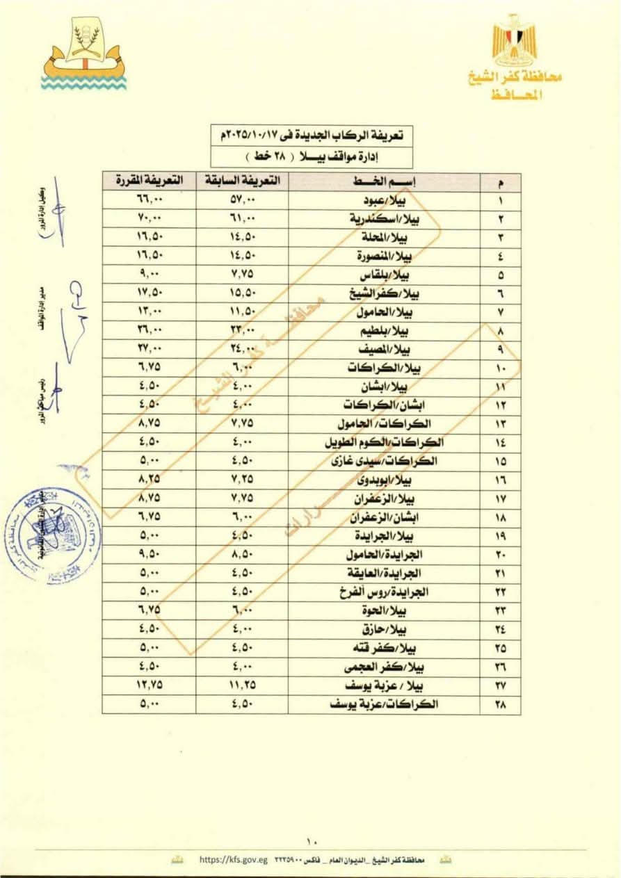 اعتمد اللواء دكتور علاء عبد المعطي، محافظ كفر الشيخ، اليوم الجمعة، التعريفة الجديدة لنقل الركاب على جميع خطوط المواصلات العامة، الداخلية والخارجية، بنطاق المحافظة، وذلك عقب قرار لجنة التسعير التلقائي للمنتجات البترولية بوزارة البترول بتحريك أسعار المنتجات البترولية اعتبارًا من اليوم، محذرًا من استغلال المواطنين أو تحصيل أي مبالغ إضافية تتجاوز التعريفة الرسمية المقررة.