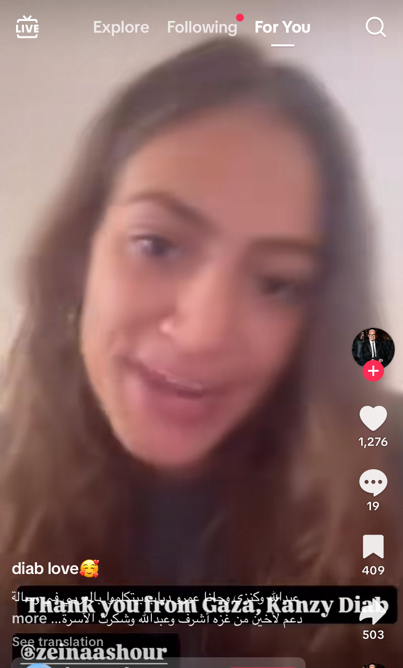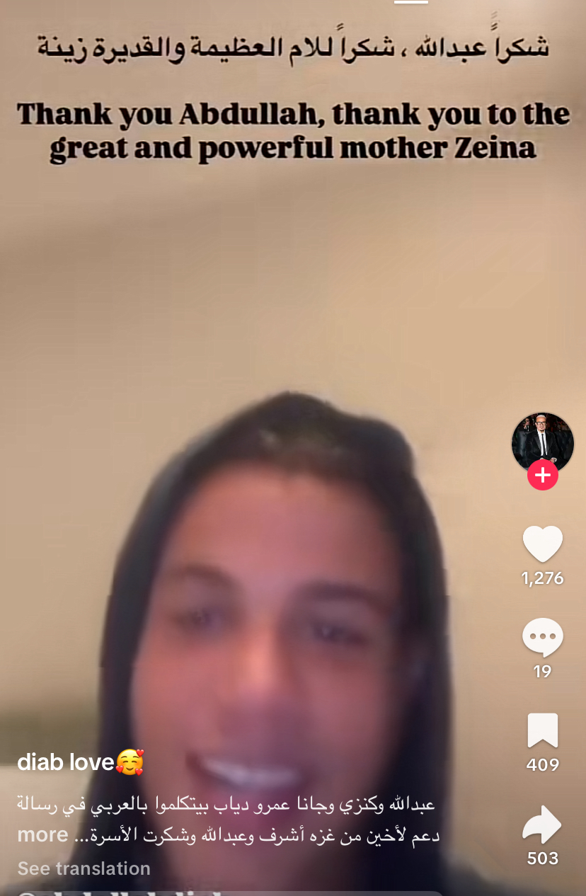 وقال عبدالله عمرو دياب، أن والدته زينة تحب الشعب الفلسطيني وهو يحبهم أيضًا وأضاف “الله يكون معكم”.