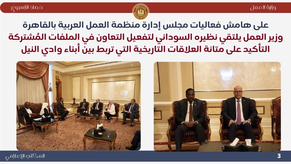 وزارة العمل في أسبوع| رئاسة عربية جديدة وتعاون أكاديمي.. وتشغيل آلاف الشباب