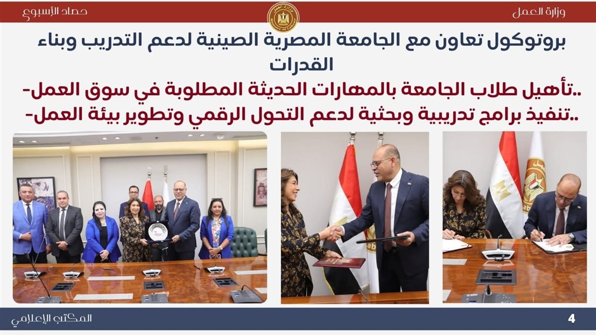 في القاهرة، شهد الوزير توقيع بروتوكول تعاون بين وزارة العمل والجامعة المصرية الصينية، لدعم التدريب وبناء القدرات في مجالات الذكاء الاصطناعي والأمن السيبراني والتكنولوجيا التطبيقية.