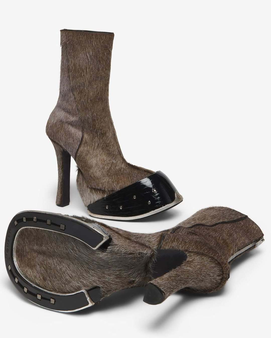 يتميز الحذاء بتصميم أفان غارد استثنائي، حيث يتخذ الكعب شكلاً منحوتاً يحاكي الحافر، مما يجعله نقطة محورية في أي إطلالة. ويغطي الجزء العلوي من الحذاء الفرو الفاخر، مع تزيينات معدنية صارخة تتمثل في مسامير فضية دقيقة تشبه المسامير المثبتة، لمنح التصميم لمسة نهائية درامية ولافتة.