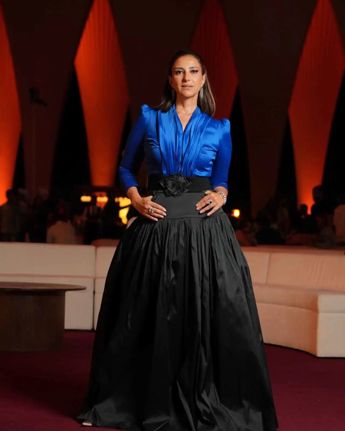 ظهرت إلهام شاهين بإطلالة خارجة عن المألوف، حيث ارتدت توب مزخرف وكاب طويل فوق بنطلون أزرق داكن. الإكسسوارات متعددة الألوان أضافت حيوية وعصرية إلى الإطلالة، مؤكدة على جرأتها في كسر النمط الكلاسيكي المعتاد.