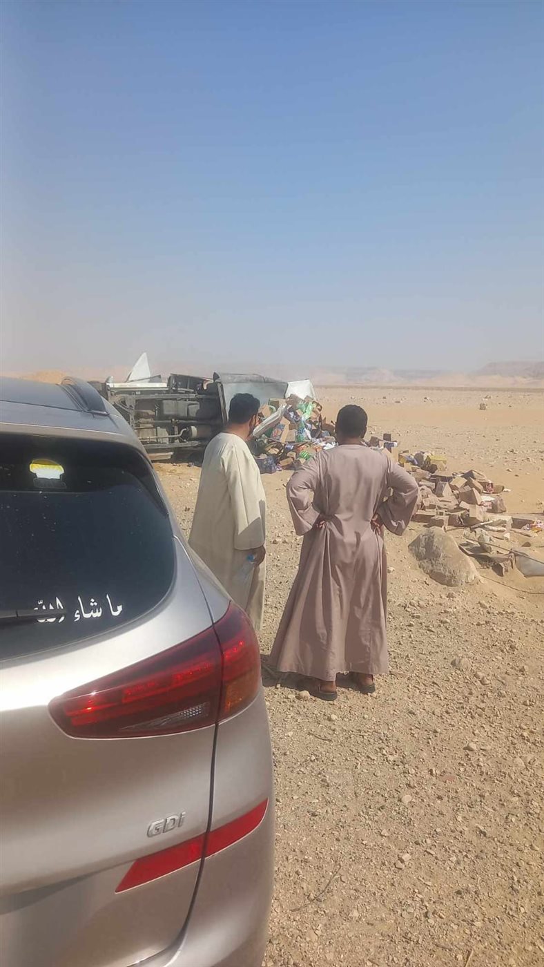 انقلاب سيارة نقل محملة بالمواد الغذائية في طريق نجع حمادي قنا الصحراوي