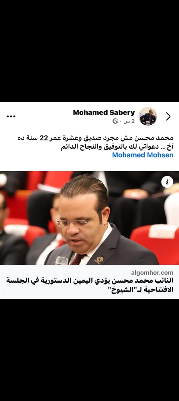 وجه رئيس تحرير موقع نيوز رووم، الأستاذ أحمد صبري وشقيقه رئيس تحرير موقع الجمهور، محمد صبري التهنئة إلى محمد محسن حسنين، عضو مجلس الشيوخ، بعد أداء اليمين الدستورية خلال الجلسة الافتتاحية للمجلس في بداية أعمال الفصل التشريعي الثاني.
