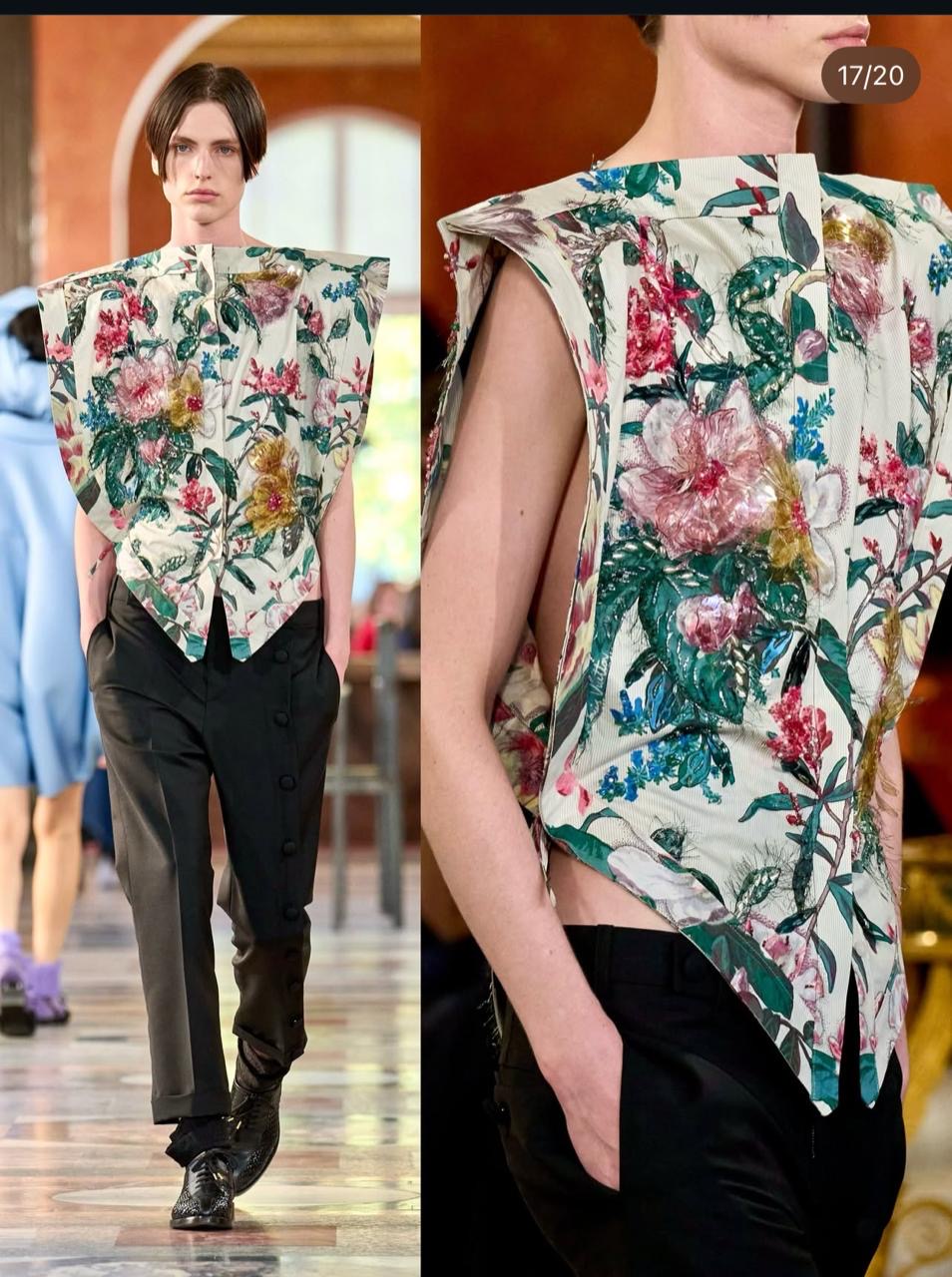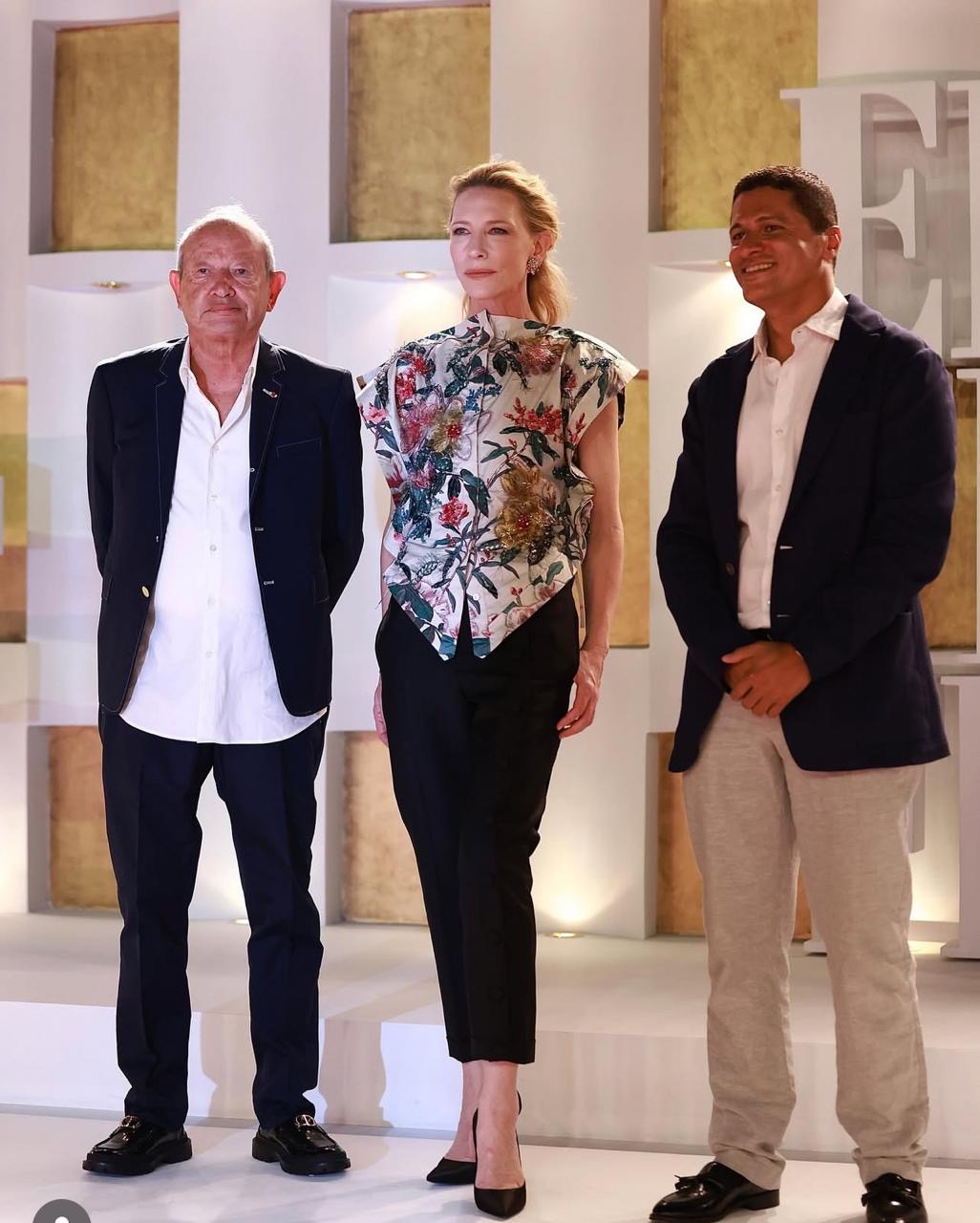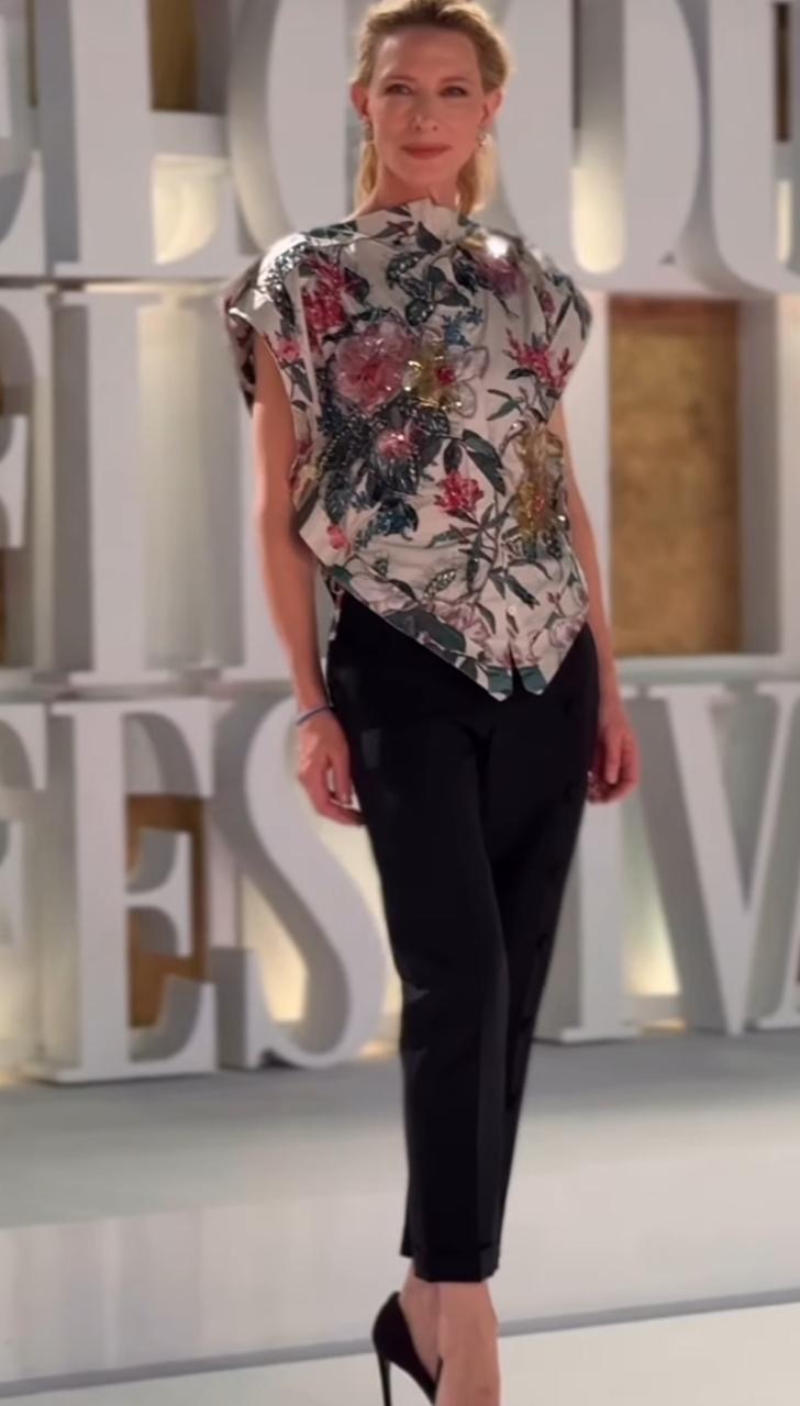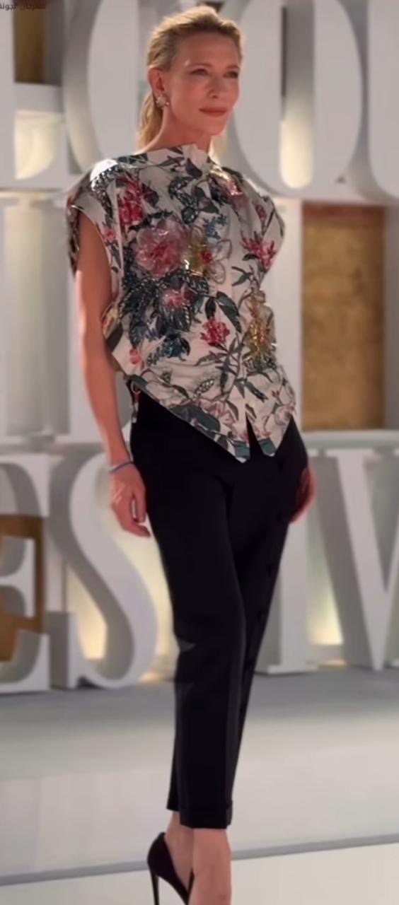 وارتدت النجمة العالمية كيت بلانشيت، إطلالة تضمنت توب مزين بالزهور الملونة والمطرزة يتميز بأكتاف مدببة من توقيع دار الأزياء الفرنسية الفاخرة louis vuitton وضمن مجموعة ربيع وصيف 2026.