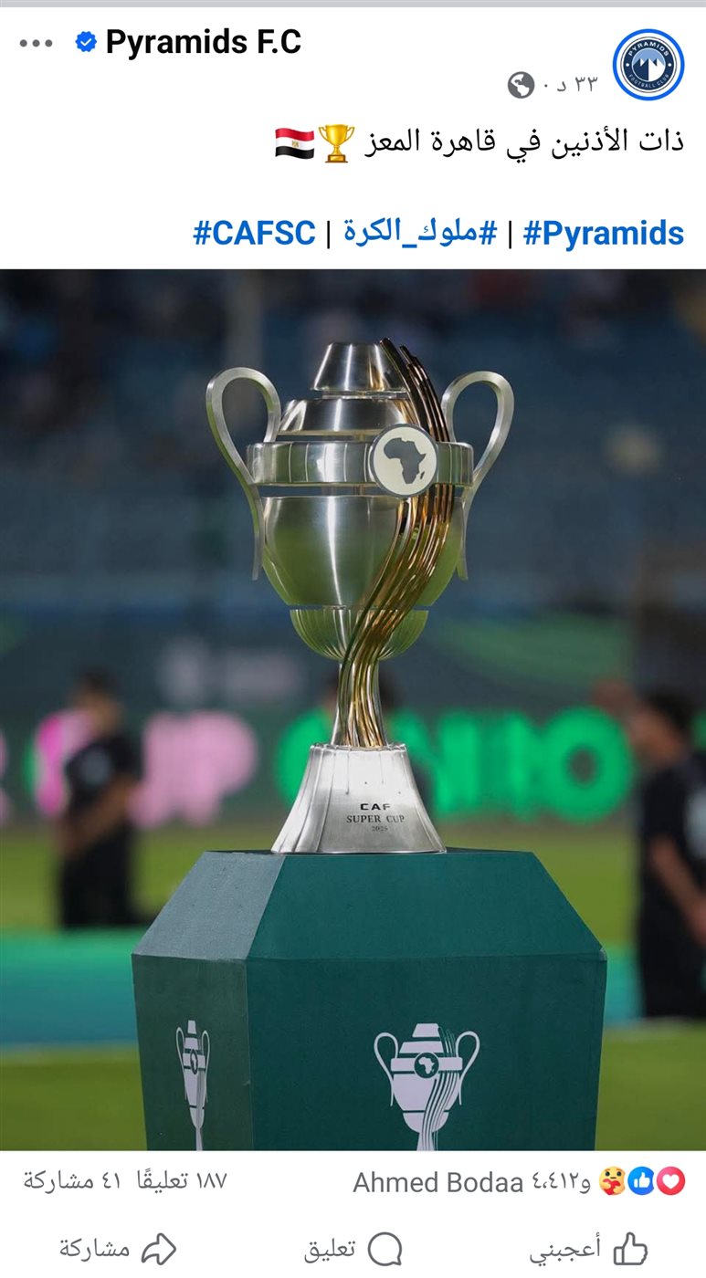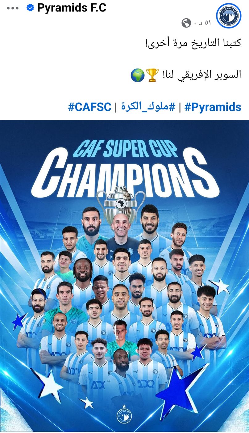 احتفل حساب فريق بيراميدز، بحصده لقب كأس السوبر الإفريقي للمرة الأولى في تاريخه، بعد فوزه القاتل مساء اليوم السبت، على فريقه نهضة بركان المغربي، بنتيجة 1-0.