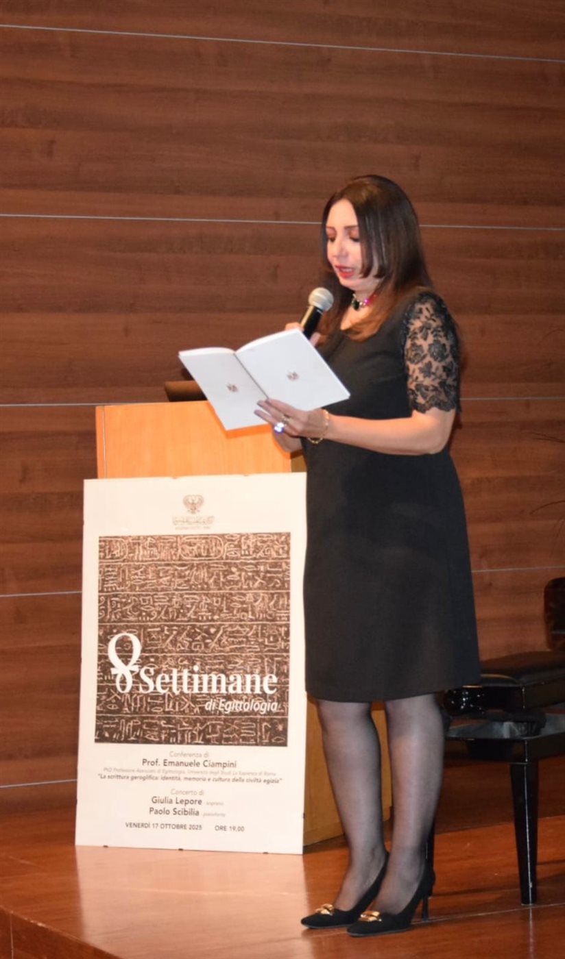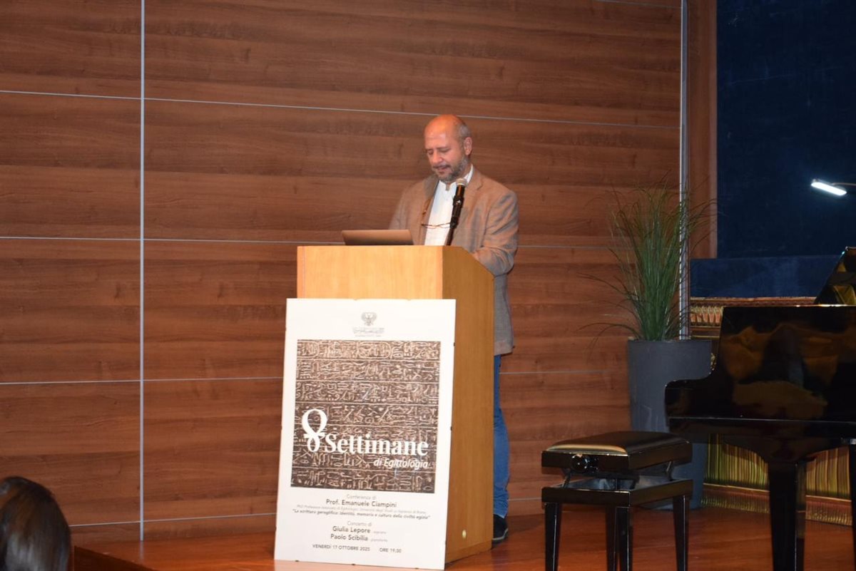 وعقب الكلمة، دعت مديرة الأكاديمية الأستاذ الدكتور إيمانويل شامبيني، أستاذ علم المصريات بجامعة “لا سابينزا” العريقة في روما، إلى المنصة لإلقاء محاضرته الشيقة. وقد تناول خلالها محاور متعددة حول الحضارة المصرية القديمة، مسلطاً الضوء على دورها في تعليم العلوم والفنون للعالم، ومبرزاً تفرد رموزها الهيروغليفية.