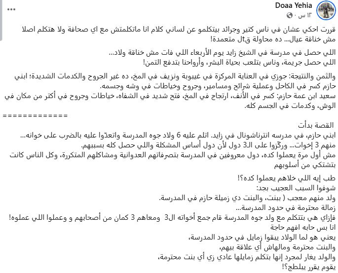 وتابعت الأم سرد الواقعة من بدايتها، قائلة: «ابني حازم، في مدرسة إنترناشونال في زايد، اتلم عليه 6 ولاد جوه المدرسة واتعدوا عليه بالضرب على خوانة، منهم 3 إخوات... وركزوا على الـ3 دول، لأن دول أساس المشكلة واللي حصل كله بسببهم».
