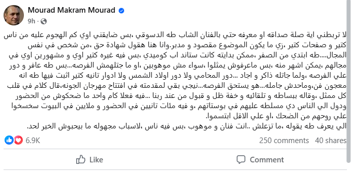 حيث علق مراد مكرم قائلًا: “لا تربطني أية صلة صداقة أو معرفة حتى بالفنان الشاب طه دسوقي، بس ضايقني أوي كم الهجوم عليه من ناس كتير وصفحات كتير، زي ما يكون الموضوع مقصود و مدبر، وأنا هنا هقول شهادة حق، من شخص في نفس المجال، طه ابتدي من الصفر، ممكن بدايته كانت ستاند أب كوميدي، بس فيه غيره كتير أوي و مشهورين أوي في مجالهم، يمكن اشهر منه، بس ماعرفوش يمثلوا، سواء مش موهوبين، أو ما جتلهمش الفرصة، بس طه عافر و دور على الفرصة، ولما جاتله ذاكر و اجاد دور المحامي ولا دور أولاد الشمس ولا أدوار تانية كتير اثبت فيها طه اأنه معجون فن، وماحدش جامله، هو يستحق الفرصة، نيجي بقي لمقدمته في افتتاح مهرجان الجونة، قال كلام في قلب كل ممثل، وقاله ببساطة و تلقائية و خفة ظل و قبول من عند ربنا، فيه فعلا كام واحد ما ضحكوش من الحضور ودول اللي الناس دي مسلطة عليهم في بوستاتهم، وفيه مئات تانيين في الحضور وملايين في البيوت سخسخوا على روحهم من الضحك، أو على الاقل ابتسموا، اللي يعرف طه يقوله ما تزعلش، أنت فنان وموهوب، بس فيه ناس، لأسباب مجهولة ما بيحبوش الخير لحد.”